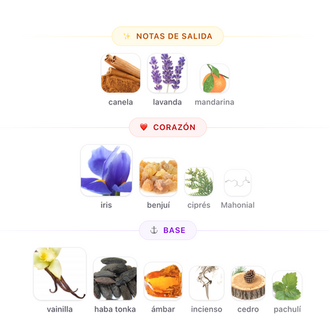 - Notas de salida: Canela, Lavanda y Mandarina (apertura aromática y especiada)