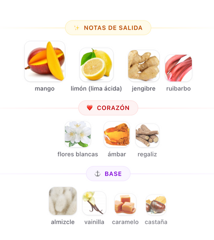 • Notas de salida: Mango, Jengibre, Limón, Ruibarbo (apertura tropical, ácida y refrescante)