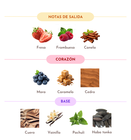 - Notas de salida: Fresa, Frambuesa y Canela (apertura jugosa, dulce y ligeramente picante)