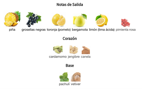 • Notas de salida: Piña, grosellas negras, toronja (pomelo), bergamota, limón (lima ácida), pimienta rosa