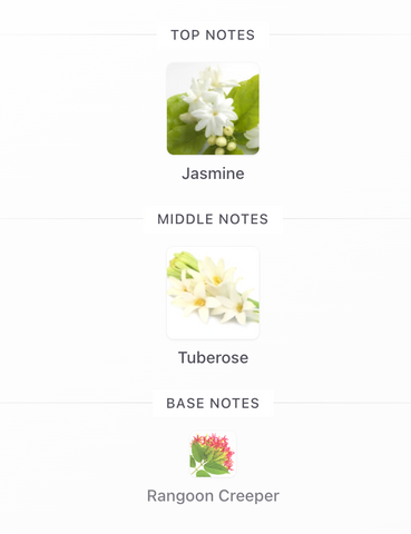 - Notas principales: Nardos (tuberosa), absoluto de jazmín sambac, piscuala (Rangoon creeper)