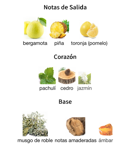 - Notas de salida: Piña, Pomelo (Toronja), Bergamota (apertura cítrica y vibrante)