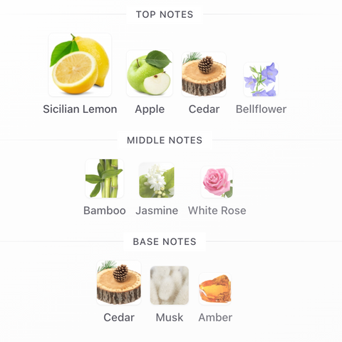 - Salida: Limón siciliano (lima siciliana), manzana, cedro, jacinto silvestre