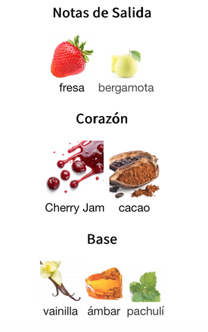 • Notas de corazón: Mermelada de cereza (Cherry Jam), Cacao (corazón de postre oscuro)
