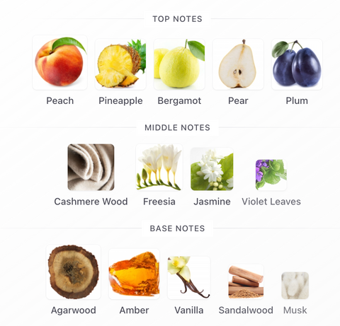• Notas de salida: Piña, Durazno (melocotón), Pera, Ciruela, Bergamota (apertura ultra jugosa, tropical y dulce)