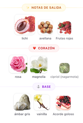 - Notas de corazón: Malvavisco (Marshmallow), Flor de Azahar y Notas lácticas (corazón esponjoso, floral y cremoso)