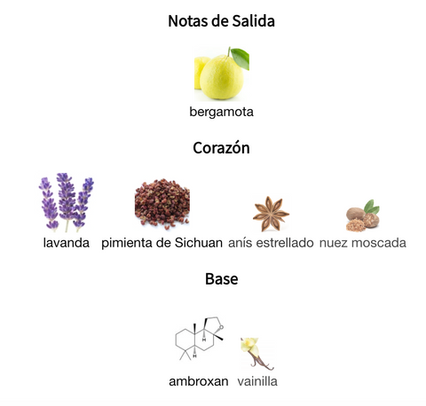- Notas de corazón: Pimienta de Sichuan, Lavanda, Anís estrellado, Nuez moscada (corazón especiado y aromático)