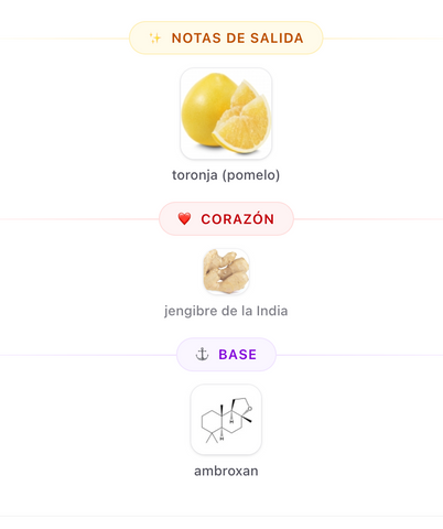 - Notas de salida: Toronja (pomelo) y Bergamota (apertura cítrica, amarga y ultra refrescante)