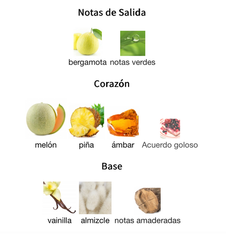 - Notas de corazón: Melón, Piña, Notas dulces, Ámbar (corazón frutal jugoso)