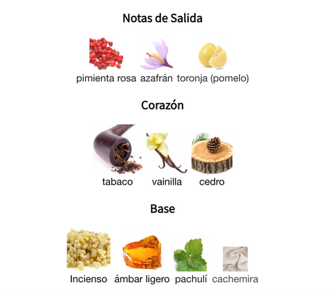 • Notas de corazón: Tabaco, Cedro, Vainilla (corazón cálido, seco y amaderado)
