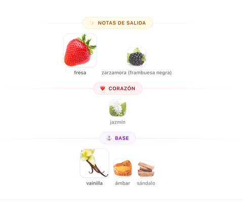 - Notas de salida: Fresa, Zarzamora (explosión de frutos rojos dulces)