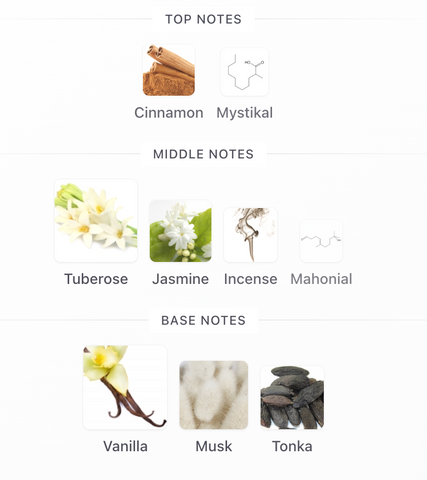 - Notas de salida: Canela, Acorde Mystikal (una nota vibrante de incienso aldehídico)