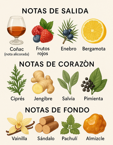 - Notas de salida: Coñac (nota alicorada), frutos rojos, enebro, bergamota
