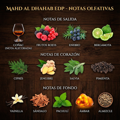 Mahd Al Dhahab ("Cuna de Oro") de Arabiyat Prestige es una fragancia lujosa y embriagadora, lanzada en 2024. Inspirada en el nicho de culto Drunk Lovers, esta composición se aleja de lo tropical para ofrecer una experiencia "boozy" (alicorada) y sensual. Su apertura es una mezcla adictiva de coñac y frutos rojos, que da paso a un corazón aromático de ciprés y especias, descansando sobre una base cálida de vainilla y maderas. Es perfecta para quienes buscan un aroma nocturno, sofisticado y diferente a todo lo comercial.