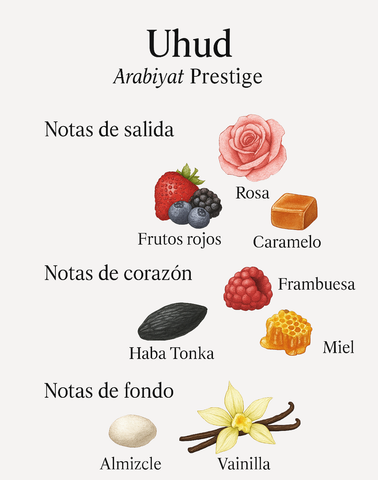Uhud de Arabiyat Prestige es una fragancia gourmand lanzada en 2024, conocida en redes como el "Bianco Latte de Frambuesa". Su aroma es exquisito, cremoso y suave, evocando la sensación de un helado de vainilla con sirope de frutos rojos y caramelo. A diferencia de los perfumes árabes pesados, Uhud es una nube esponjosa y lactónica: dulce, reconfortante y con una nota de miel que le da calidez sin ser agresiva. Es ideal para quienes buscan oler a postre fino de una manera elegante y no invasiva.