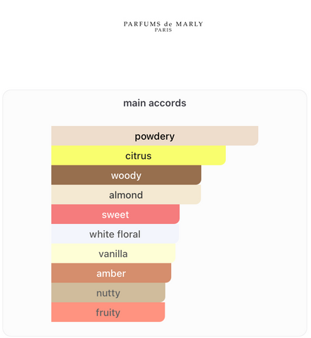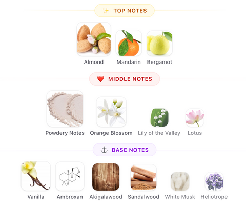 - Notas de salida: Almendra aterciopelada, Mandarina, Bergamota (apertura cítrica con un toque gourmand suave)
