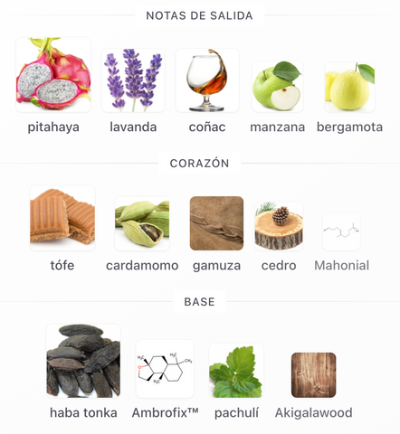 - Notas de salida: Fruta del Dragón (Pitahaya), Coñac, Manzana, Bergamota y Lavanda (apertura exótica, licorosa y vibrante)