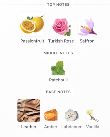 - Notas de salida: Maracuyá (Fruta de la pasión), Rosa Turca, Azafrán (apertura tropical, dulce y especiada)