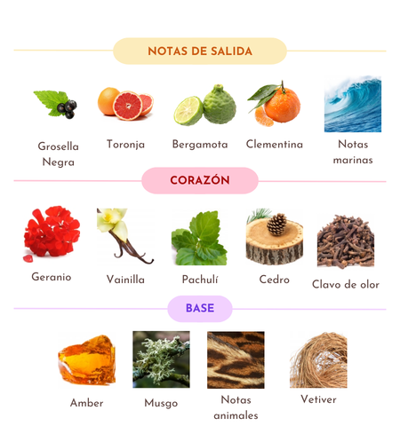 - Notas de salida: Toronja, Bergamota, Clementina, Grosella Negra y Notas Marinas (frescura energética y chispeante)